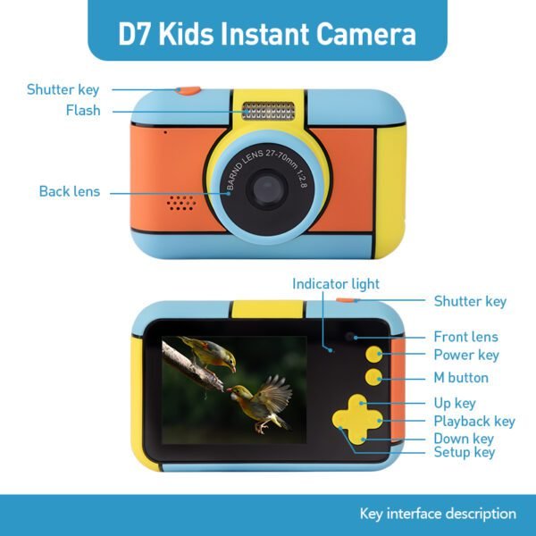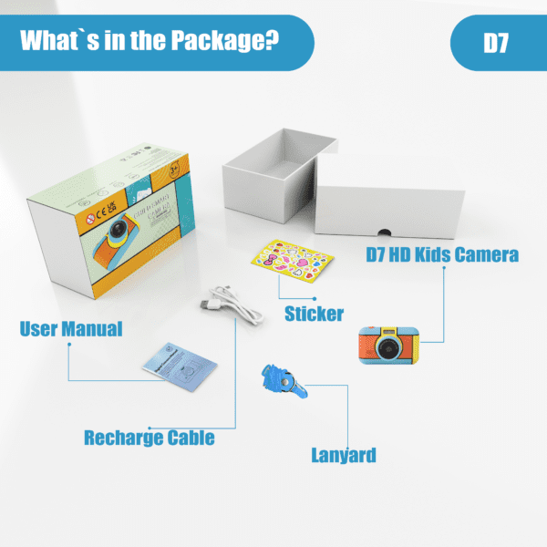 Dječija kamera D7 idealna je kao prvi fotoaparat za dijete – jednostavna, sigurna i edukativna, podstiče maštu, kreativnost i ljubav prema fotografiji od najranijeg uzrasta.